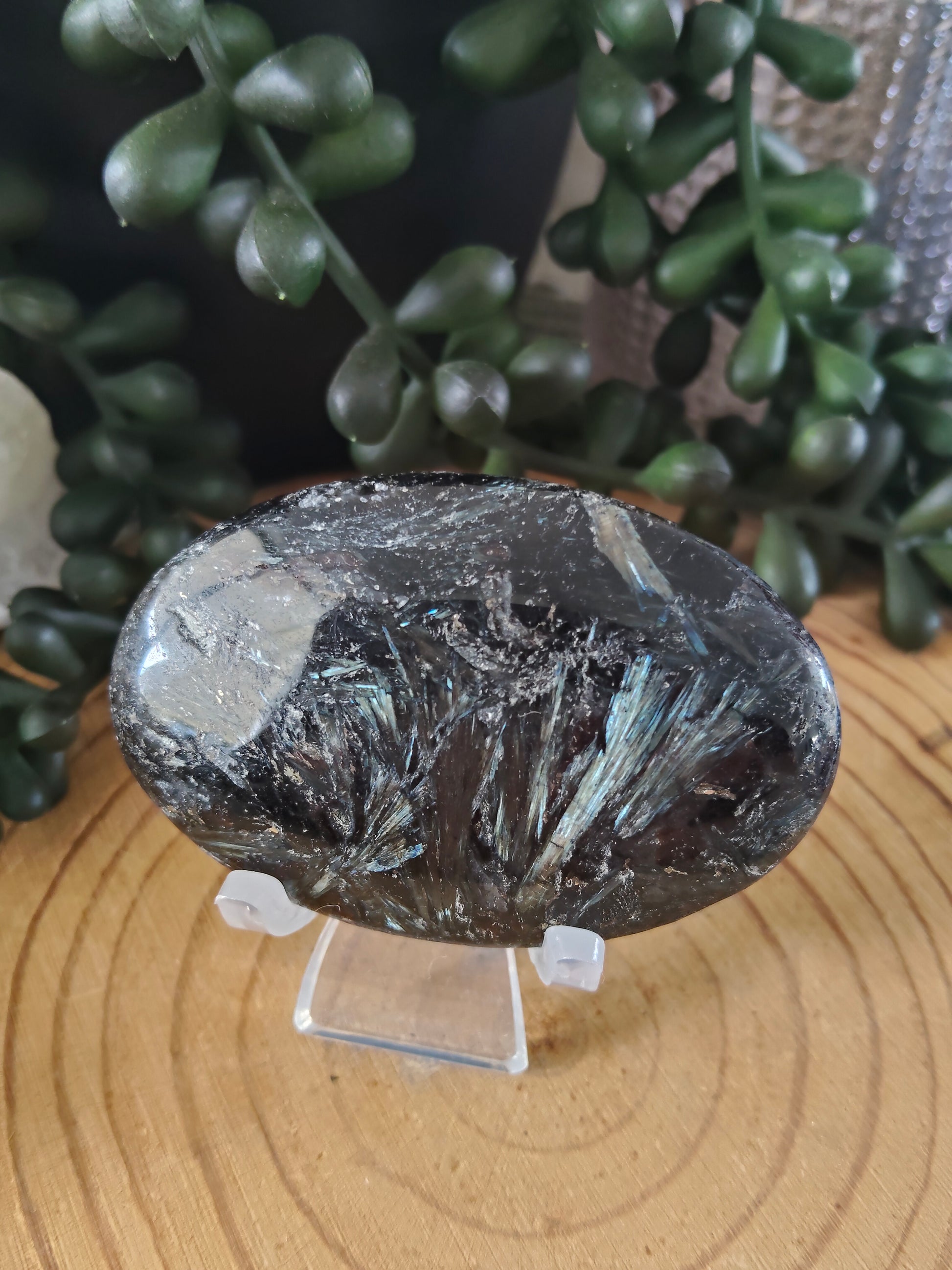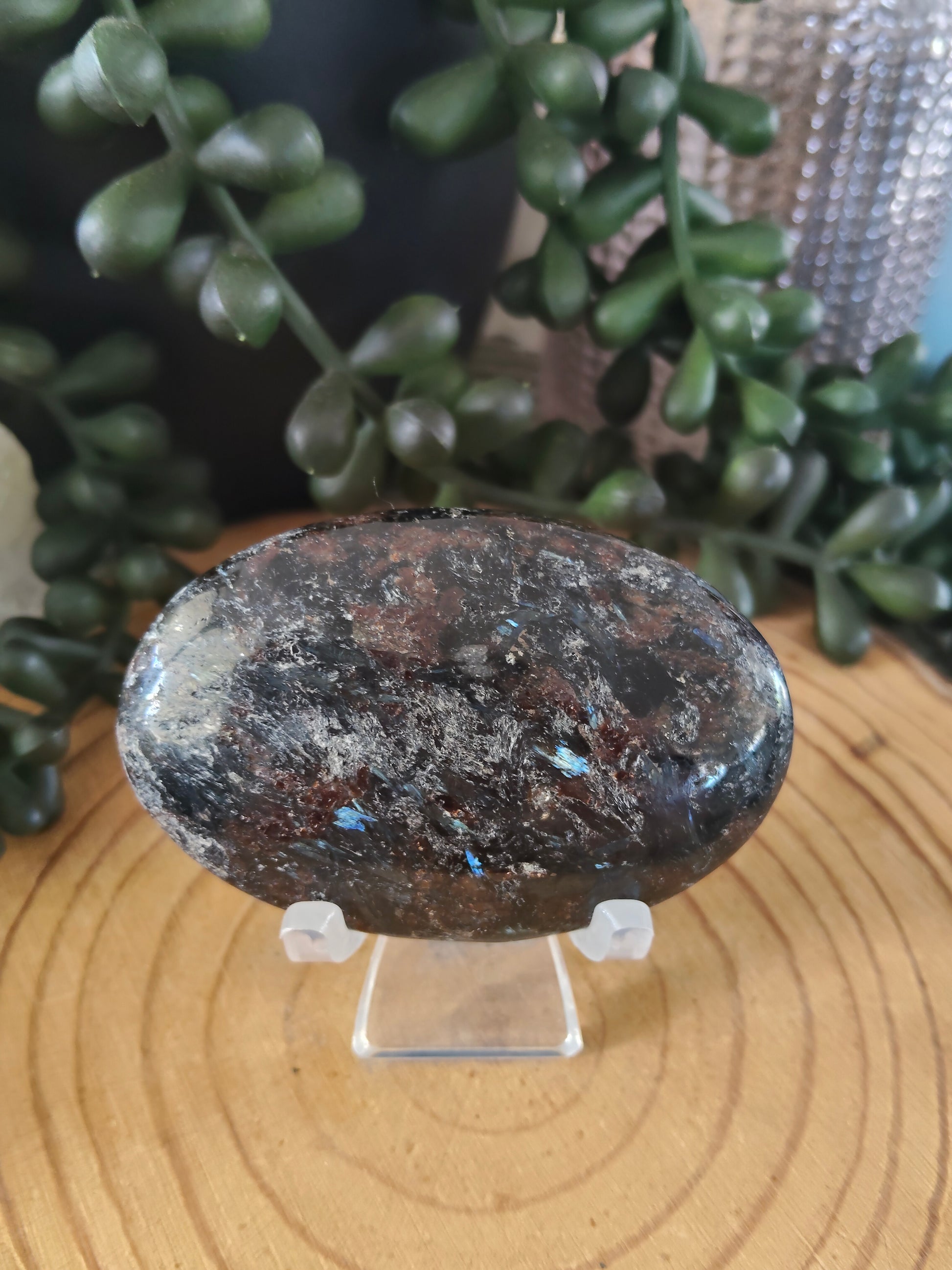 Gorgeous arfvedsonite with garnet palmstones with beautiful blue/green flashes 💙💚✨
