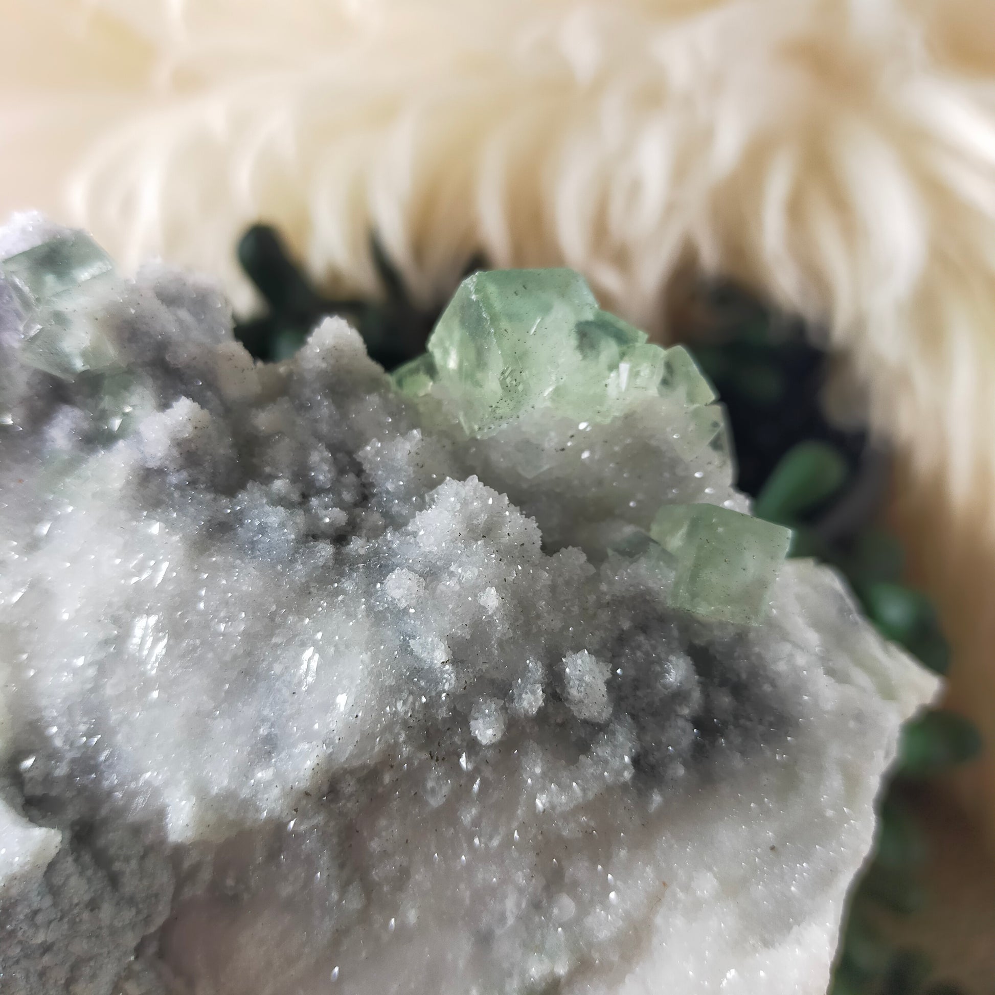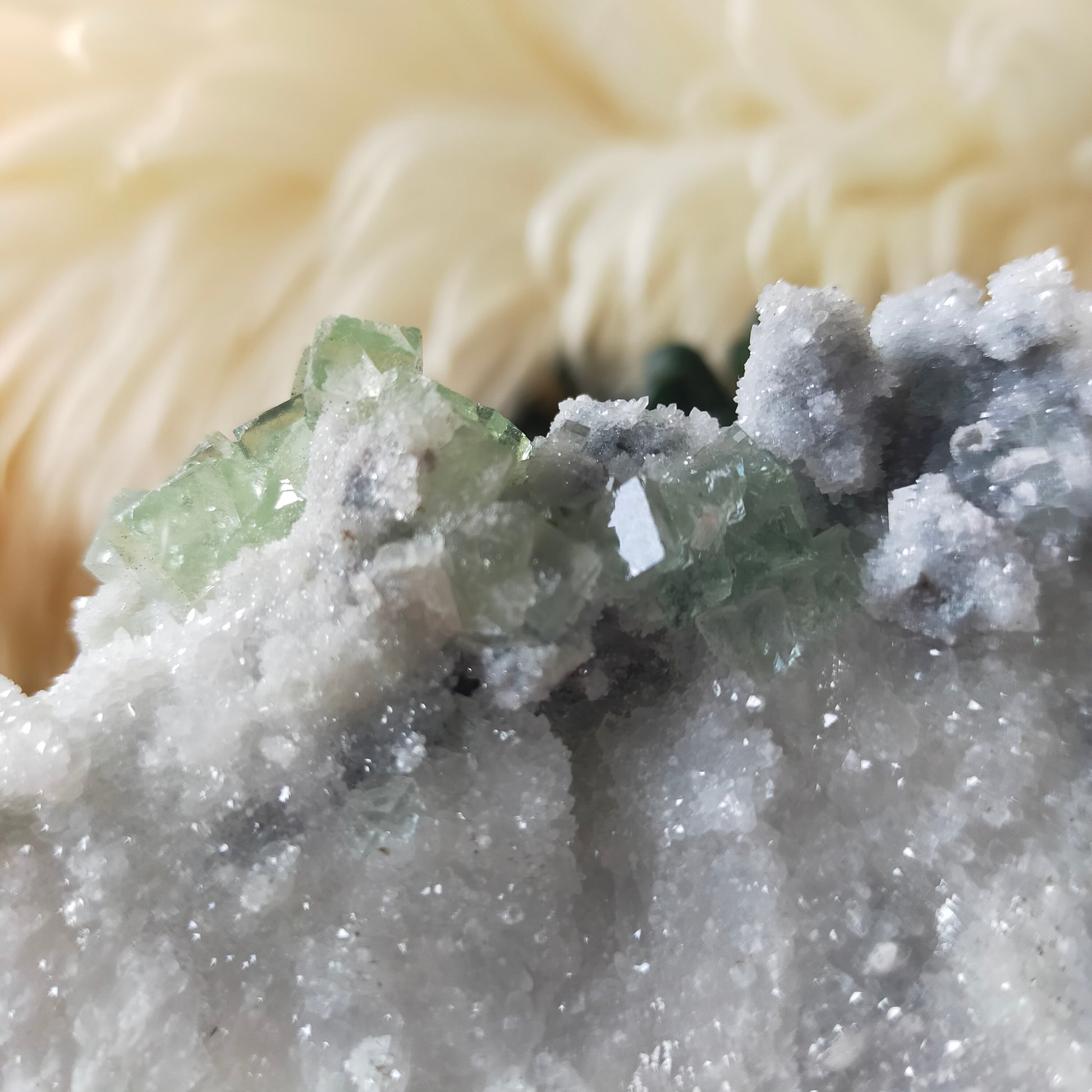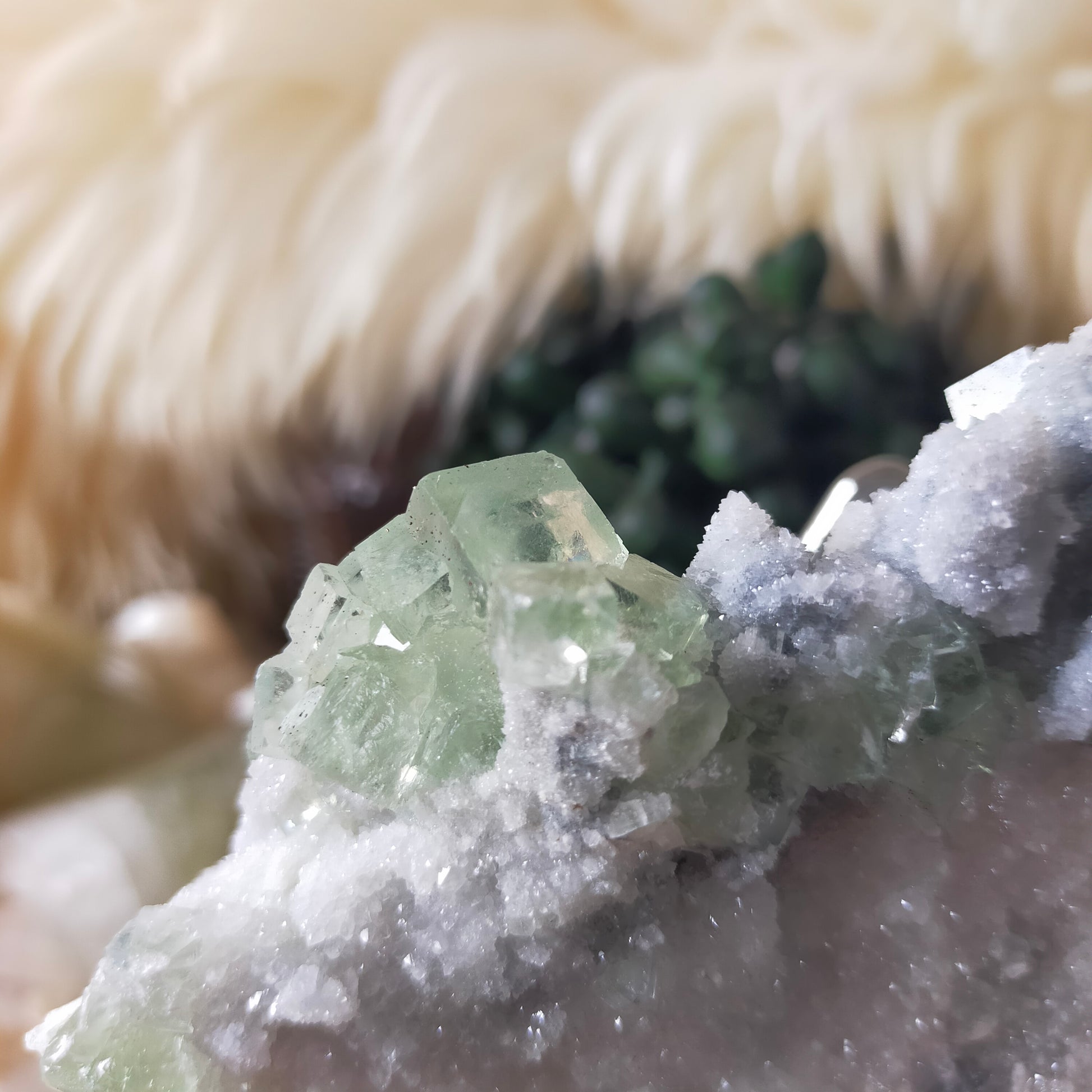 Gorgeous cubic fluorite specimen with amazing sparkly 'sugar' coating πβ¨ The cubes are perfect and the green fluorite is perfectly transparent π«