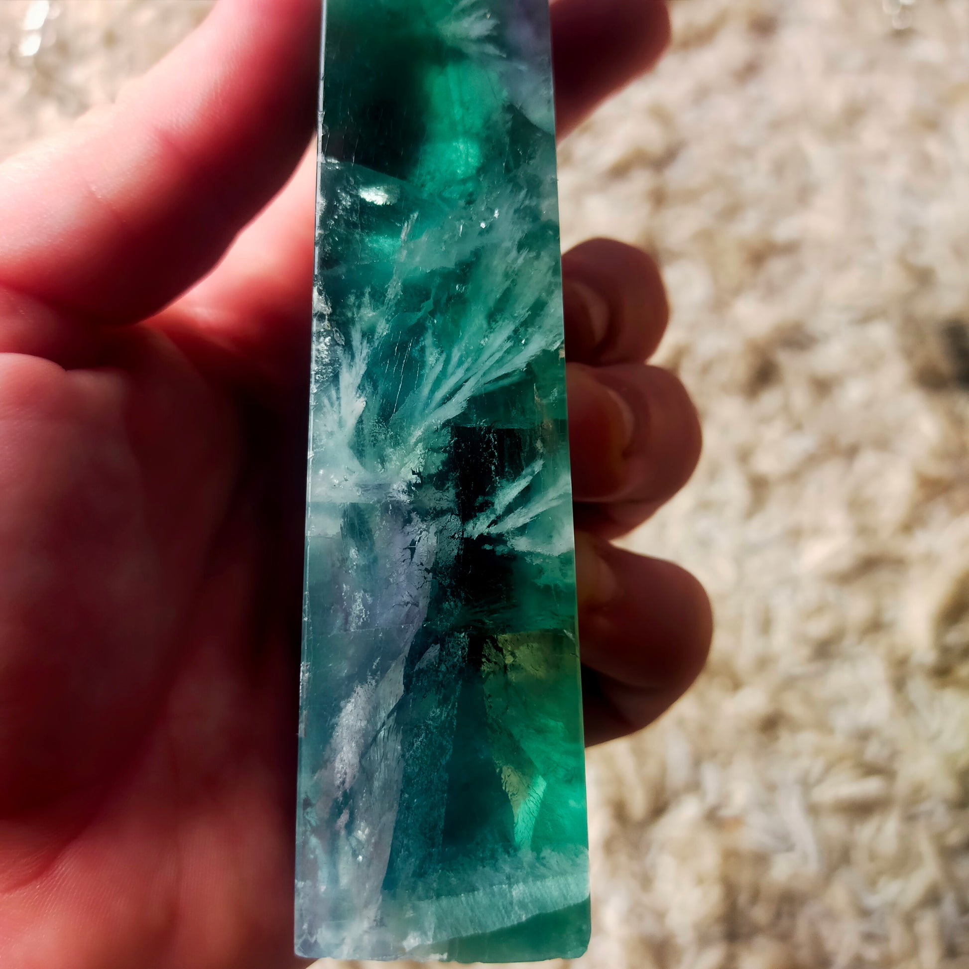 Stunning feather fluorite Tower with beautiful rainbows 💚💜💙🤍✨